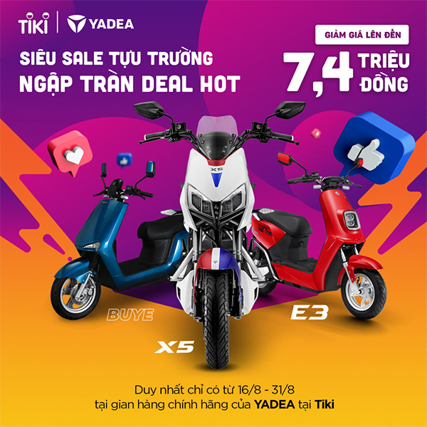 Chương trình cho các đơn hàng trên cửa hàng Yadea chính hãng tại TIKI. Cụ thể, deal giảm giá có thời hạn từ 16/8 đến 31/8/2021. Trong thời gian này, khách hàng sẽ thoải mái lựa chọn mẫu xe điện yêu thích và chốt đơn với giá cực tốt.
