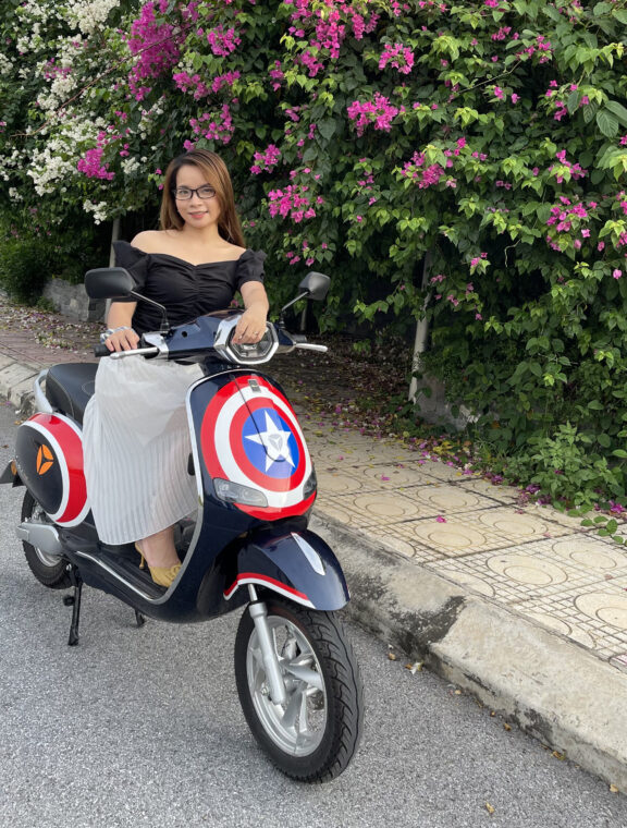Ngay khi sở hữu xế cưng, cô nàng GenZ đã biến Odora thành chiếc xe điện độ với vẻ ngoài nổi bật. Chiếc xe được "khoác" bộ tem mới theo phong cách Captain America. Màu xe xanh navy cùng tone màu của Đội trưởng Mỹ tạo nên sự kết hợp không thể "chất" hơn.